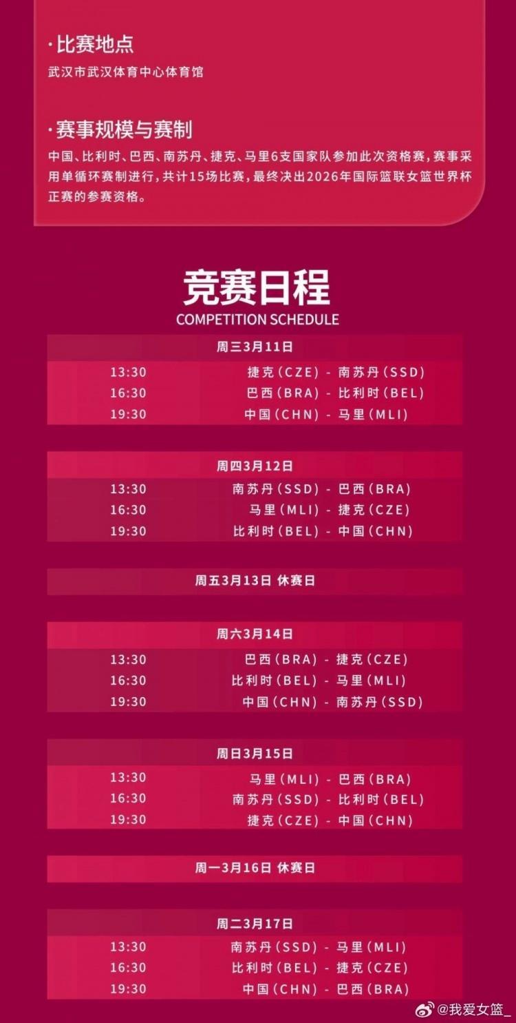 中国女篮将坐镇主场在武汉参加世预赛,如今武汉赛区公布具体竞赛日程。中国女篮将从3月11日到17日,7天之内先后对阵马里女篮、比利时女篮、南苏丹女篮、捷克女篮和巴西女篮。